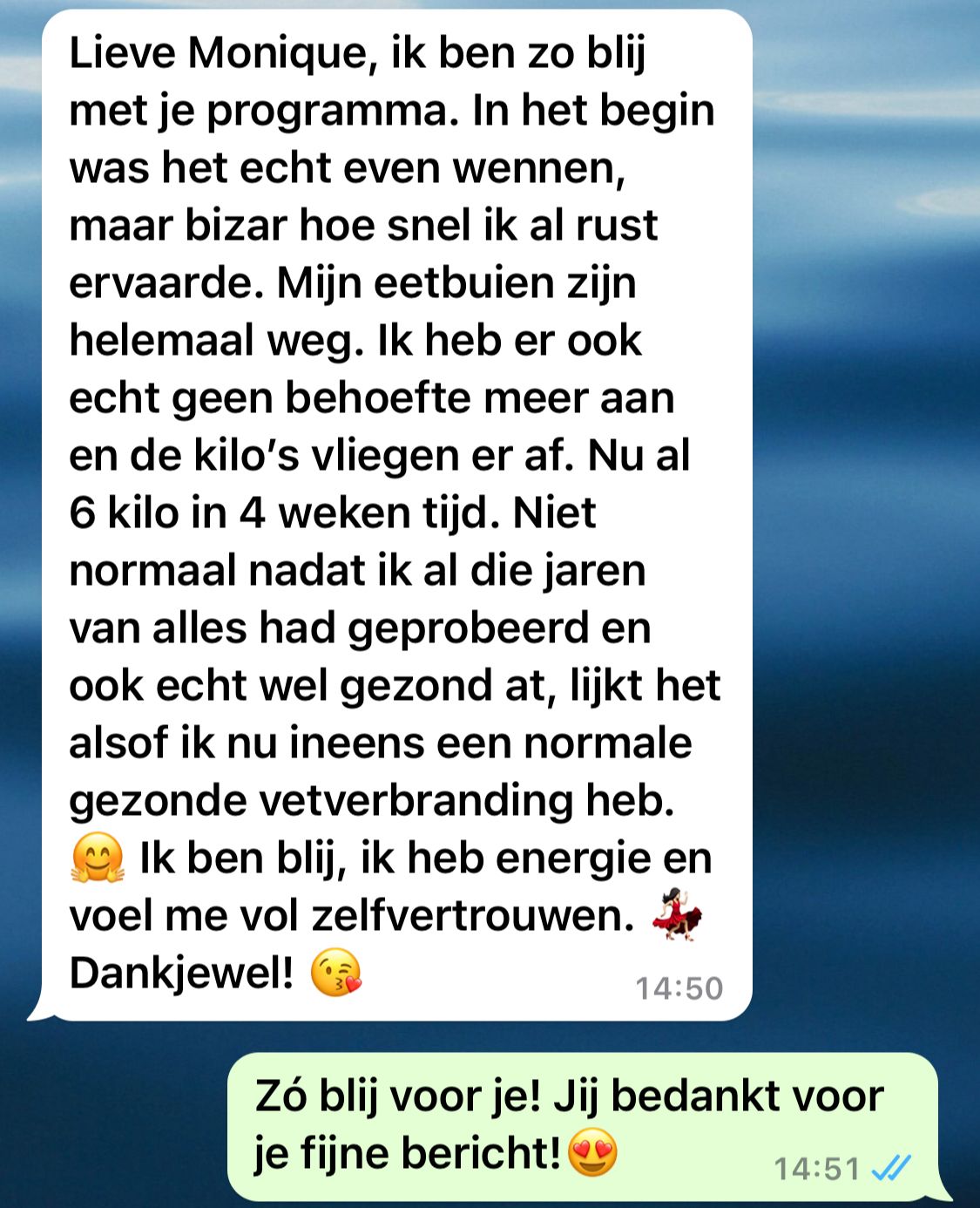 Maar het allerbelangrijkste is dit: je krijgt je lichaam weer terug. Je gaat je lichter voelen, helderder in je hoofd, minder moe. Minder hersenmist, minder opgeblazen gevoel. Weer lekker in je lijf. Weer vertrouwen in je lichaam. En ja, ook weer in die favoriete jurk zonder dat het een gevecht is.